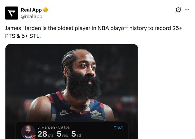 哈登在此役还创下了NBA历史第1的神迹。数据显示:36岁238天的哈登是季后赛单场砍下25分5断的最老球员。